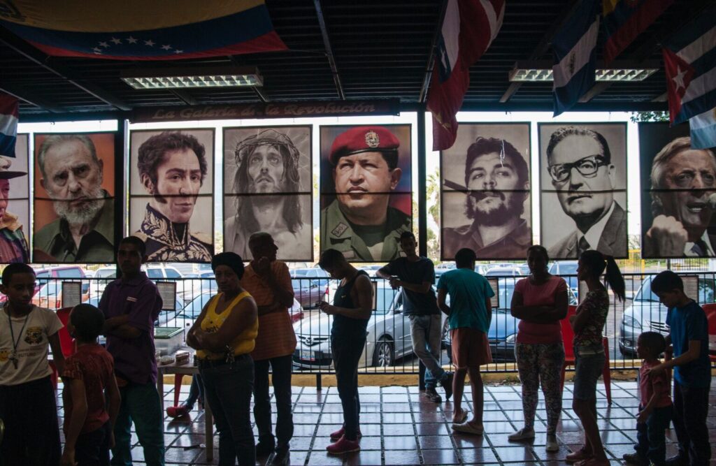 Caracas’ın 23 de Enero mahallesindeki bir barda yer alan “devrimin galerisi”. Soldan sağa: Fidel Castro, Simón Bolívar, İsa Mesih, Hugo Chávez, Che Guevara, Salvador Allende, Néstor Kirchner. (Eneas De Troya / CC BY 2.0)