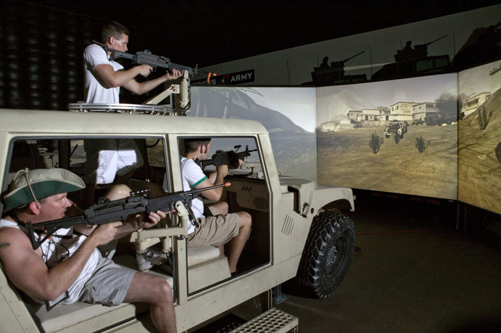 Temel bir örnek, Albay Casey Wardynski tarafından 2002’de tasarlanan ve ABD Ordusu için bir işe alım ve eğitim platformu olarak geliştirilen ücretsiz çok oyunculu nişancı oyunu America’s Army’dir.[11] Oyuncular, Ordu’nun işe alım web sitesi üzerinden giriş yapar ve Afganistan ile Irak’taki gerçek (ancak “temizlenmiş” olsa da) savaş bölgelerine dayanan ve “Czervenia” gibi isimler taşıyan kurgusal ülkelerdeki savaş senaryolarına dahil edilir. America’s Army 2002–2013 arasındaki dört sürümle olağanüstü başarılı olmuştur. On yıl içinde, on üç milyondan fazla oyuncu dünyadaki isimsiz ve sürekli genişleyen tehditlere karşı yaklaşık 260 milyon saatlik çatışmaya girmiştir.[12]