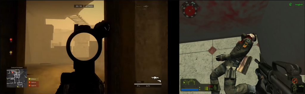 ABD Ordusunun emperyal tahayyülündeki ‘bileşik düşman’ ile Hizbullah’ın bölgesel tahayyülündeki grafik düşman üzerine karşılaştırmalı bir inceleme; solda birinci şahıs nişancı oyunu America’s Army: Proving Grounds (2015), sağda ise Special Force 2: Tale of the Truthful Pledge (2007) görülüyor. Kaynak: Jonas Staal (yön.), Propaganda Theater, Video Study (Jindřich Chalupecký Society, Prag, 2023).