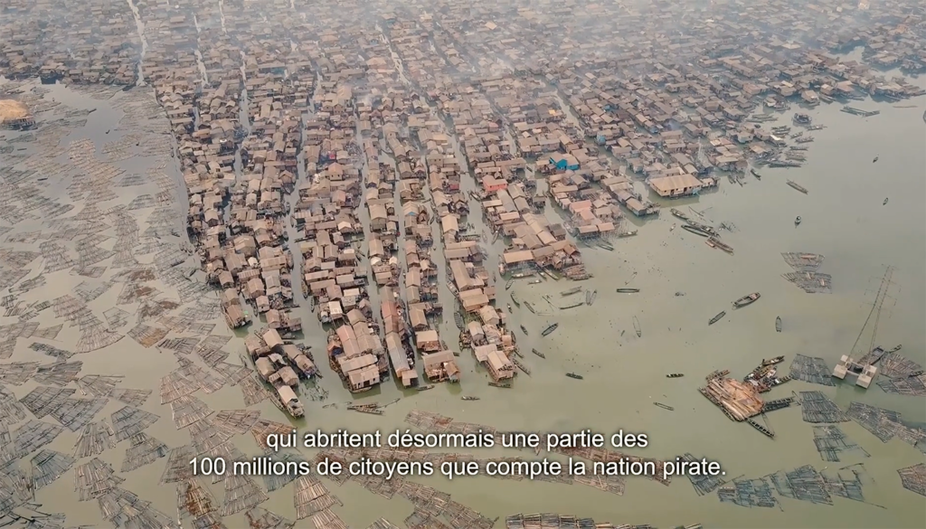 Red Team Défense / Fransa Savunma Bakanlığı (2021) tarafından hazırlanan ‘P-Nation’ senaryosunu tanıtan video özetinden bir kare; burada ulusötesi korsan uluslarının ortaya çıktığı küresel gecekondu bölgeleri tasvir ediliyor.