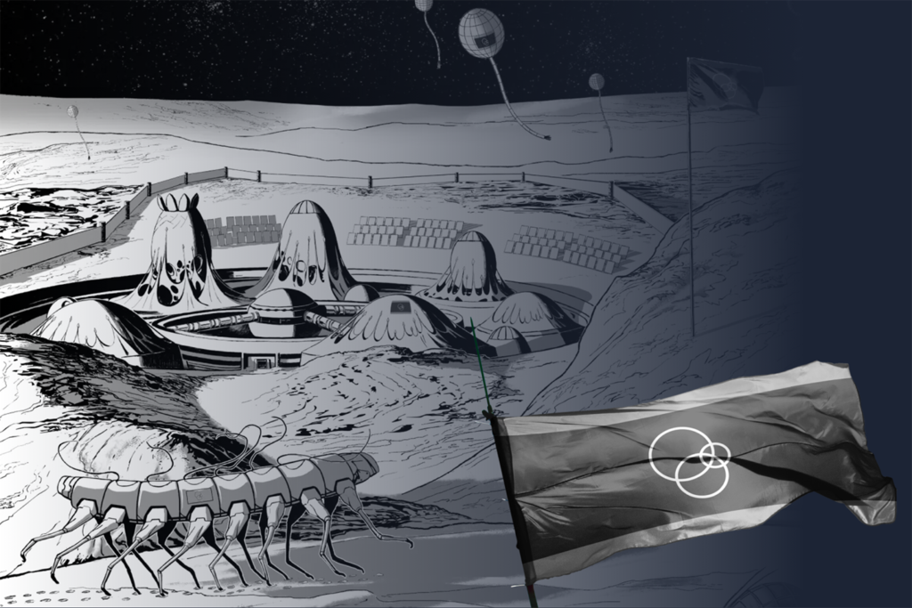 Red Team üyesi Amaury Bundgen tarafından hazırlanan ‘Uzay Hücumu’ senaryosundaki Republic of Circle’a ait ay yüzeyi maden çıkarım üssü çizimi; NATO tahayyülündeki düşmanları, istilacı ve iri bir böceği andıran varlıklar olarak temsil ediyor. 2023’te Red Team Défense / Fransa Savunma Bakanlığı tarafından yayımlandı.