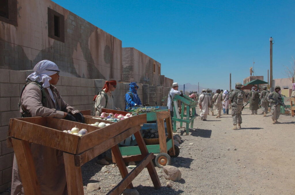 ABD askerleri, Fort Irwin’deki Ulusal Eğitim Merkezi’nin üç boyutlu simülasyon ortamında hem ‘Afgan’ yerel halkları hem de onları devriye gezen askerleri canlandırarak Afganistan’daki süregiden işgali prova ediyor. Fotoğraf: ABD Ordusu / Spc. Hanson Mendiola, 2011.