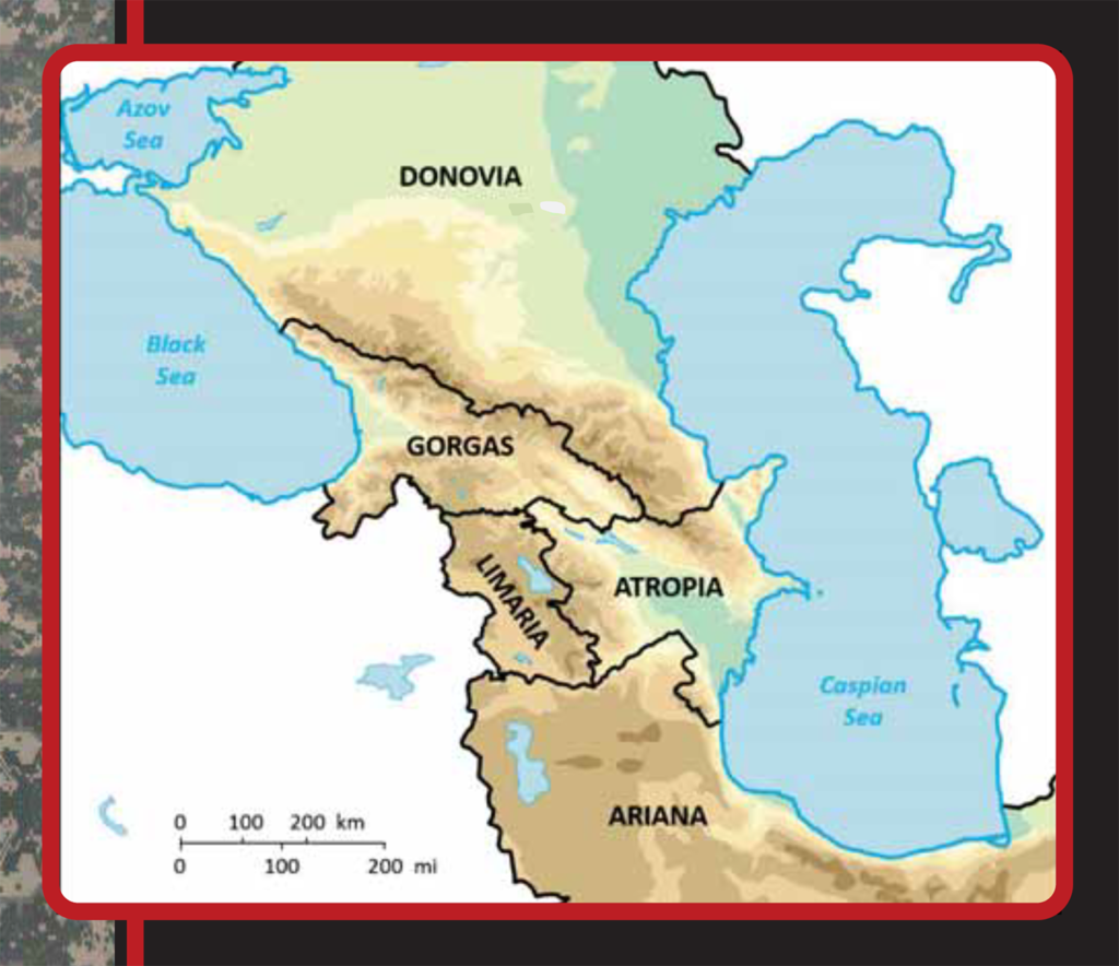 ABD Ordusu’nun 2015 tarihli ‘Decisive Action Training Environment (D.A.T.E.)’ el kitabının kapağında yer alan bileşik uluslar haritası; Donovia’nın (Rusya) Atropia’yı (Ukrayna) işgal ettiği çatışmanın ve bunu izleyen ABD vekâlet savaşının zeminini oluşturuyor.