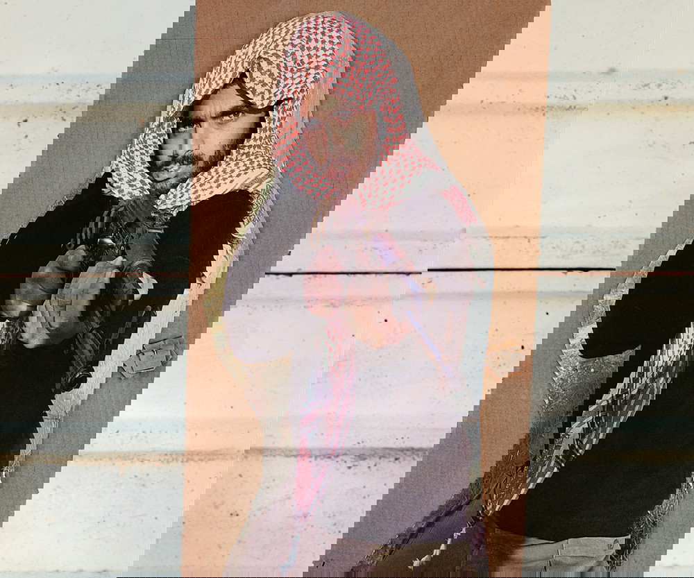 ABD askerleri, Fort Irwin’deki Ulusal Eğitim Merkezi’nin üç boyutlu simülasyon alanında kurulu Atropia’ya ait ‘Razish’ adlı kurgusal kasabada Atropia/Donovia senaryosunu canlandırıyor. Fotoğraf: Jason Miller, 2021.